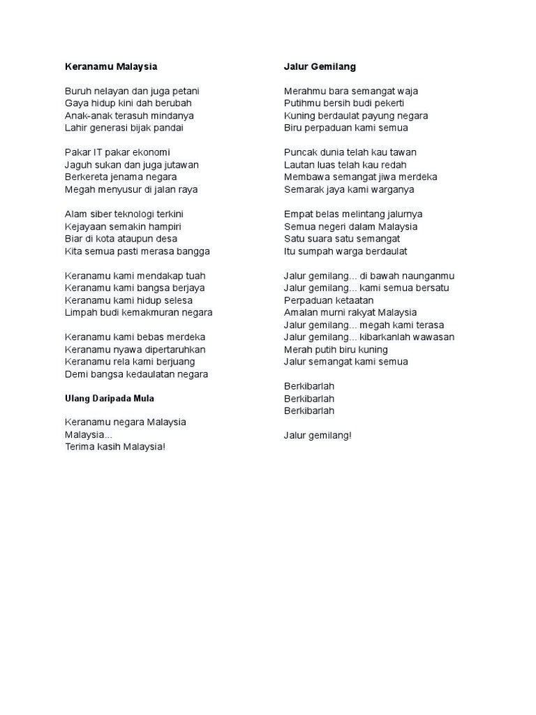 Lagu yang diciptakan oleh Safii Kemaman pada tahun 1996 ini juga kerap disebut dengan lagu Pembebasan. Koleksi Terlengkap Lagu Wajib Nasional Daerah Rp 49000. Lirik Lagu Keranamu Malaysia Lirik Lagu Keranamu Malaysia.